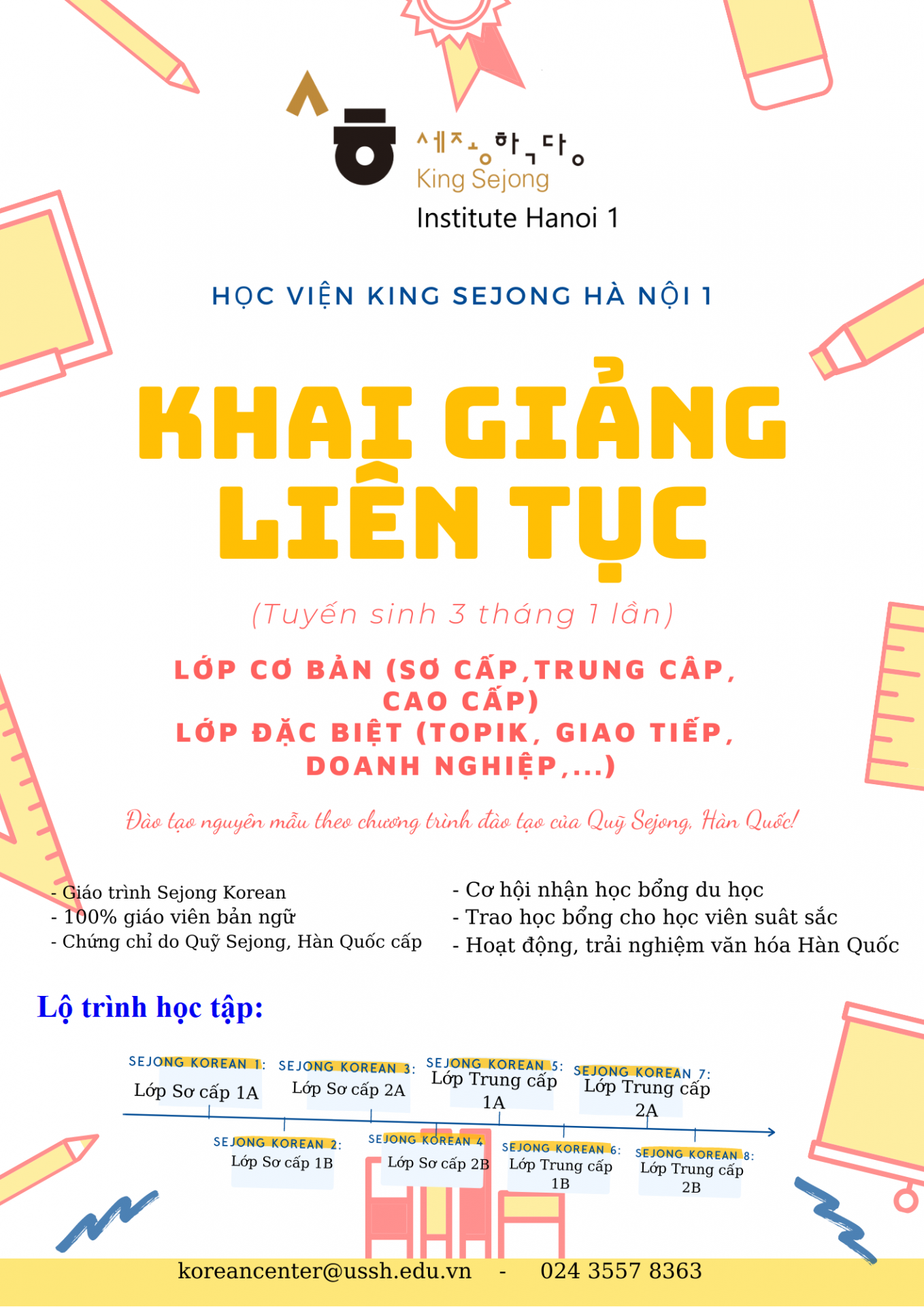 Sự đa dạng và hiện đại của các chương trình đào tạo, trình độ chuyên môn cao của đội ngũ giảng viên Hàn Quốc, tính chuyên nghiệp trong tổ chức, quản lí với một cơ cấu tổ chức tinh giản - đó là những ưu thế được Trung tâm Hàn ngữ Sejong Hà Nội sử dụng để thực hiện các khoá đào tạo, thi và cấp chứng chỉ tiếng Hàn và văn hoá Hàn Quốc đạt chuẩn chất lượng quốc gia Hàn Quốc. Đồng thời, Trung tâm Hàn ngữ Sejong Hà Nội còn thực hiện chương trình hỗ trợ du học theo học bổng Hàn Quốc.