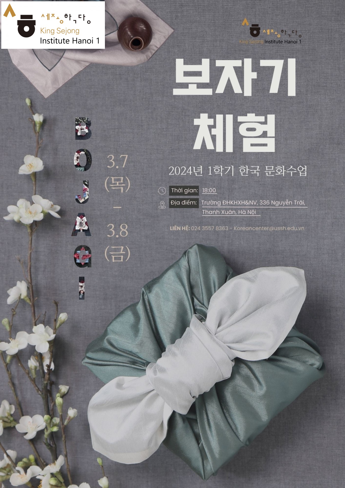 𝟏. Thời gian: 07~08/03/2024 (Thứ 5 và Thứ 6) 𝟐. Địa điểm: Phòng 505, nhà C, Trường Đại học Khoa học Xã hội và Nhân văn Hà Nội - 336 Nguyễn Trãi, Thanh Xuân, Hà Nội (Học viện King Sejong Hà Nội 1) 𝟑. Nôi dung: - Tìm hiểu về Hôn lễ truyền thống Hàn Quốc - Trải nghiệm gói quà Bojagi