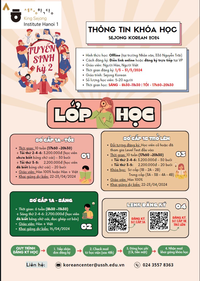ĐĂNG KÝ LỚP HỌC TIẾNG HÀN SEJONG KHÓA CƠ BẢN (K53 - KỲ 2 - NĂM 2024)
